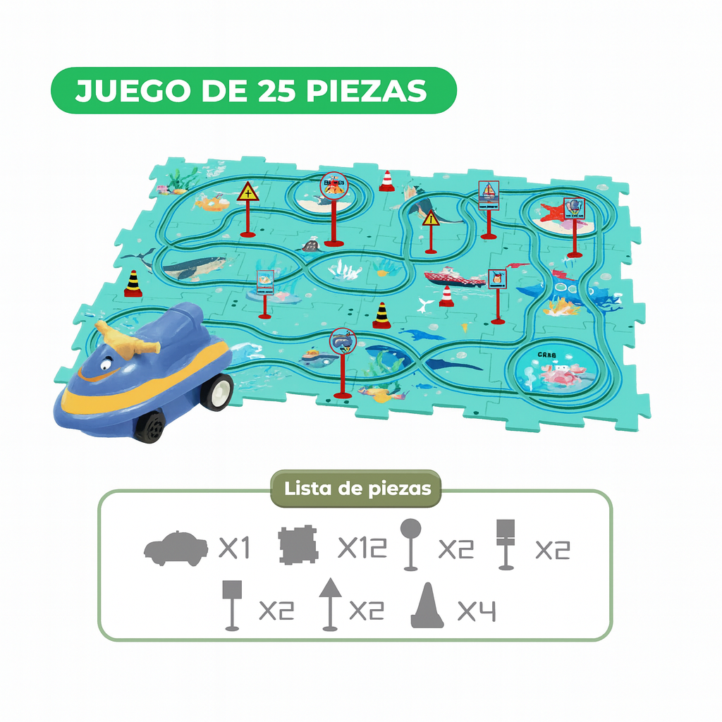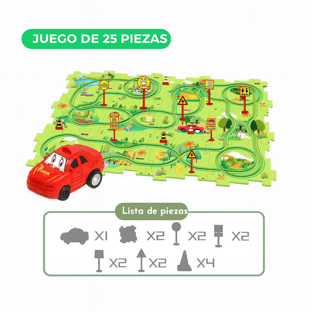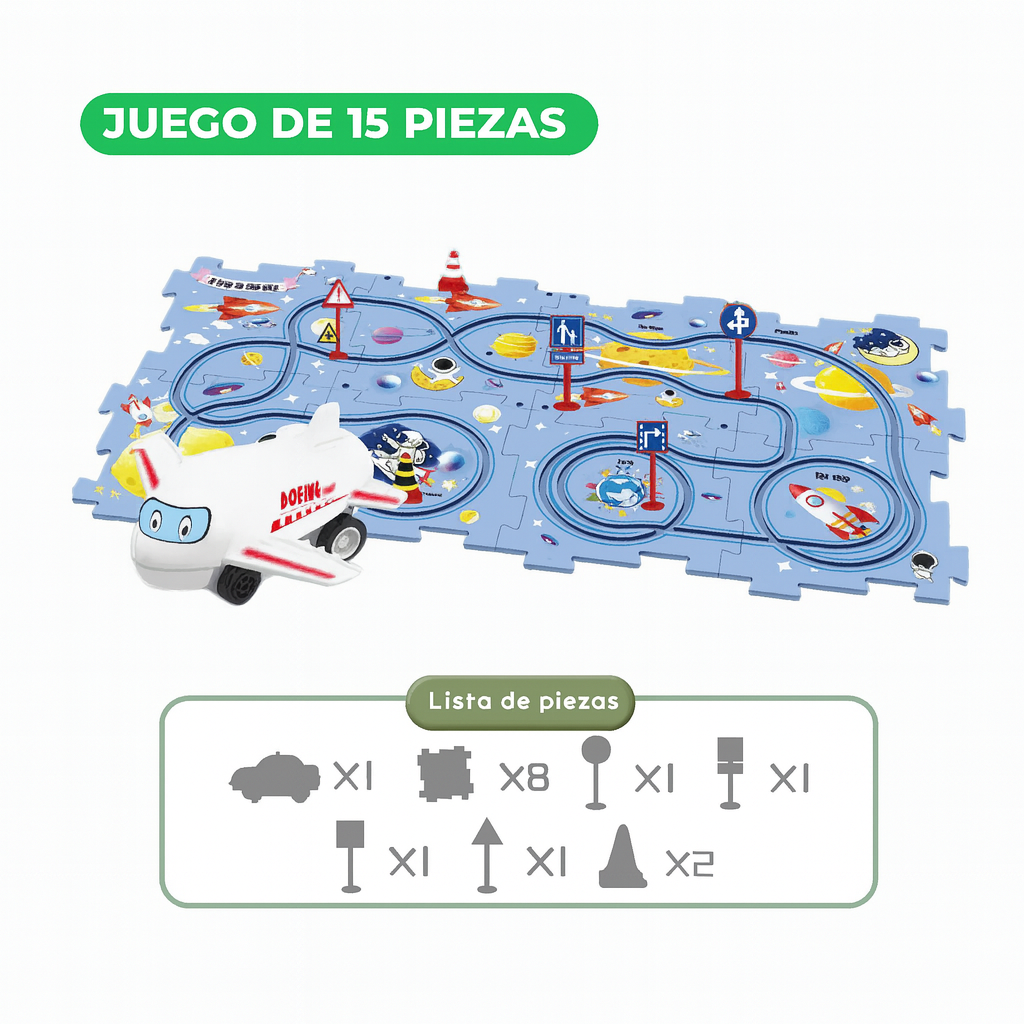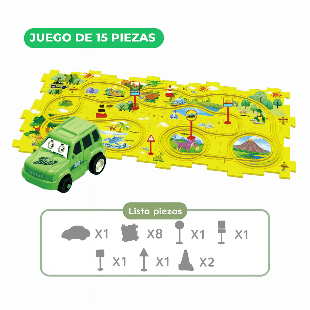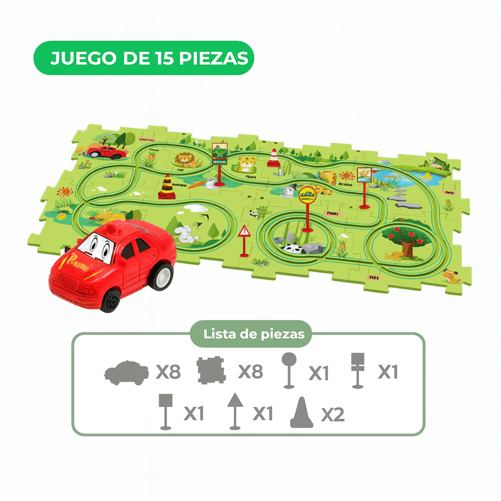 Rompecabezas de Carreras no es solo un juguete; es un ejercicio de creatividad total disfrazado de juego. En cuanto unen las piezas del rompecabezas y lanzan los autitos, quedan enganchados: aprenden a resolver problemas, a coordinar y a concentrarse sin darse cuenta.