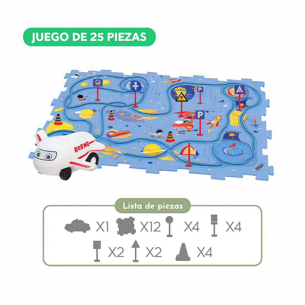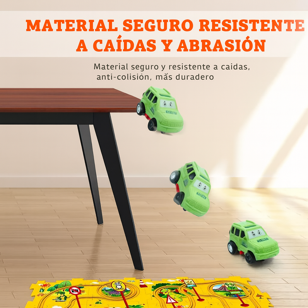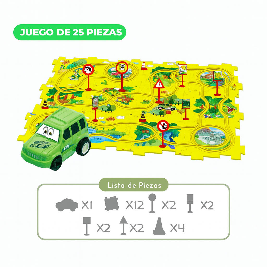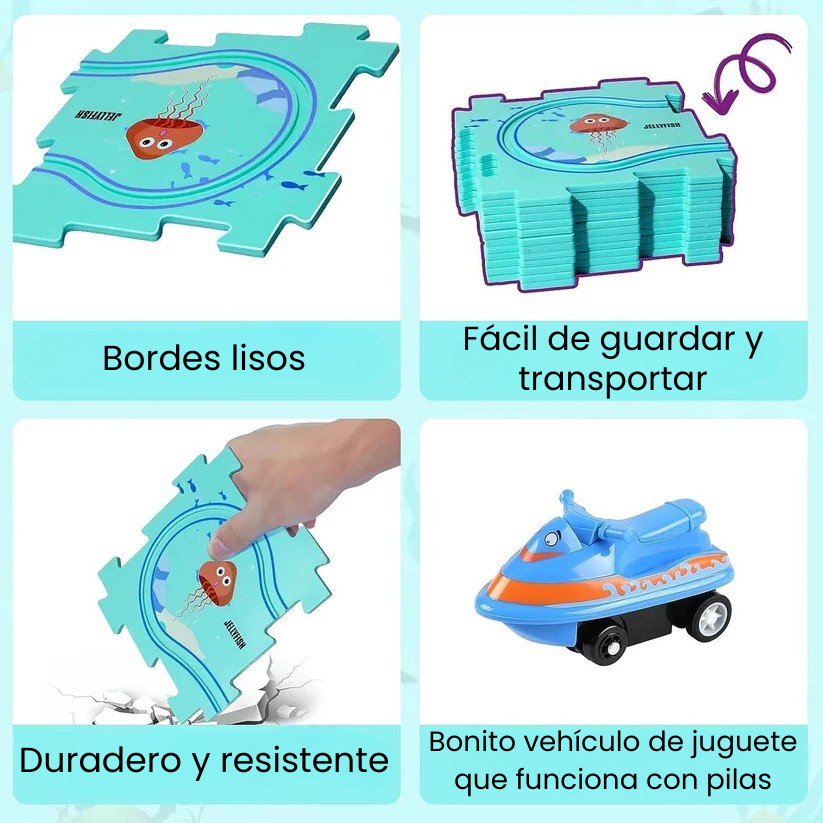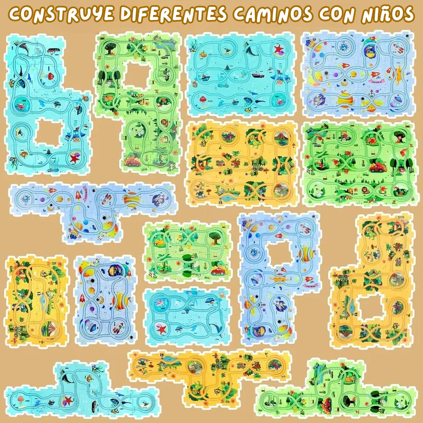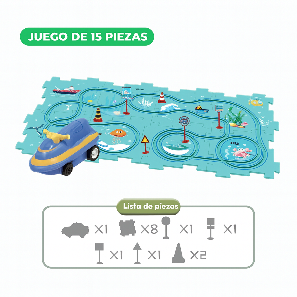 Rompecabezas de Carreras no es solo un juguete; es un ejercicio de creatividad total disfrazado de juego. En cuanto unen las piezas del rompecabezas y lanzan los autitos, quedan enganchados: aprenden a resolver problemas, a coordinar y a concentrarse sin darse cuenta.